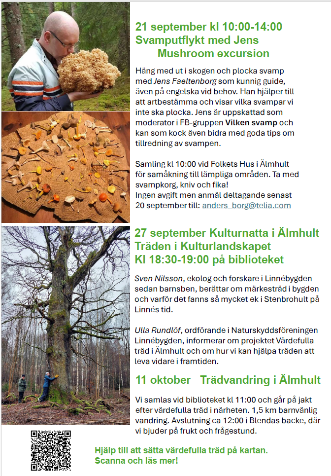 Under hösten 2025 riktar vi speciellt blickarna mot de värdefulla träden. De stora träden i vår omgivning har kanske stått där i över hundra år till glädje och nytta för många. Genom Linnébygdens projekt Värdefulla träd vill vi i samarbete med Älmhults kommun uppmärksamma träd som speciella, både biologiskt och kulturellt sett.